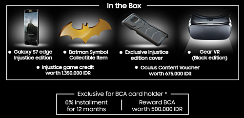 Khi điện thoại đã chính thức được công bố bởi các công ty của Hàn Quốc hồi tháng trước, nó đã được tiết lộ rằng các sản phẩm bao gồm các gói phụ kiện có thể khác nhau tùy thị trường và các nhà mạng di động. Dưới đây là những gì Samsung Galaxy S7 Edge Injustice Edition bao gồm tại Indonesia: